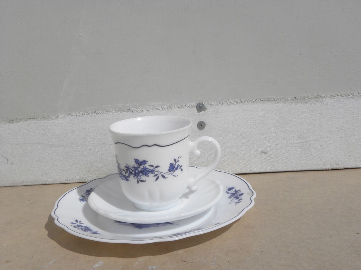 Includes: One tea cup with matching saucer and plate