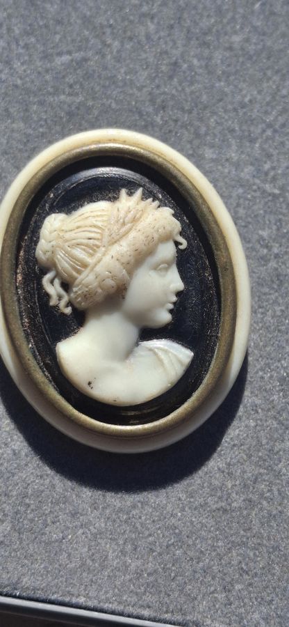 Vintage cameo brooch featuring a carved portrait on a black background.