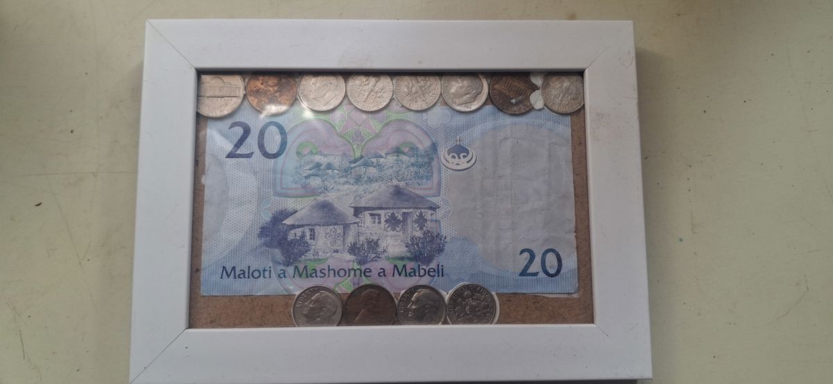 a Framed 20 Maloti banknote from Lesotho alongside several coins.
