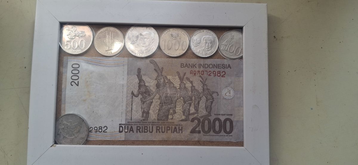 The image displays a collection of Indonesian currency, primarily a 2000 Indonesian rupiah banknote.