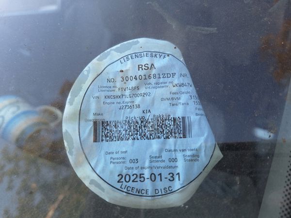 | Location: Bloemfontein Vin nr: KNCSHX71LG7009292 Registration nr: FTV148FS Disc: 2026-01-31 Km/Hours: Unknown Mechanical: Need engine overhaul. Parked for along time. Exterior: Have canopy. Canopy Have marks. Scratch marks on body of bakkie. Passenger door have bumps and is damage. Interior: Seats torn. Tyres: Poor Batteries: No Physical viewing is the responsibility of the buyer. Enatis: Yes. To be collected at seller. Please note ID and Proof of residence are required when purchasing vehicle for NCO licencing purposes. It will remain the responsibility of buyer to register the vehicle into their name within 21 days on receipt of registration documents. Vat Registered: Yes Buyers Commission: 10% Viewing Date: As per Appointment Physical viewing is the responsibility of the buyer. Invoices will not be cancelled after the auction if: 1. The buyer or his/her agent(s) did not view the asset(s) before or during the auction. 2. Assets are removed from the premises by the buyer or his/her agents. By removing the asset(s) the buyer confirms acceptance of the asset(s) in its current condition and thereby concludes the sale. Items are not tested unless otherwise specified. All items are sold “voetstoots” or “as is”. Contact: Philip 0610156516 |