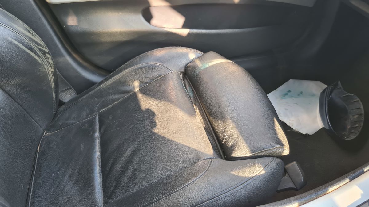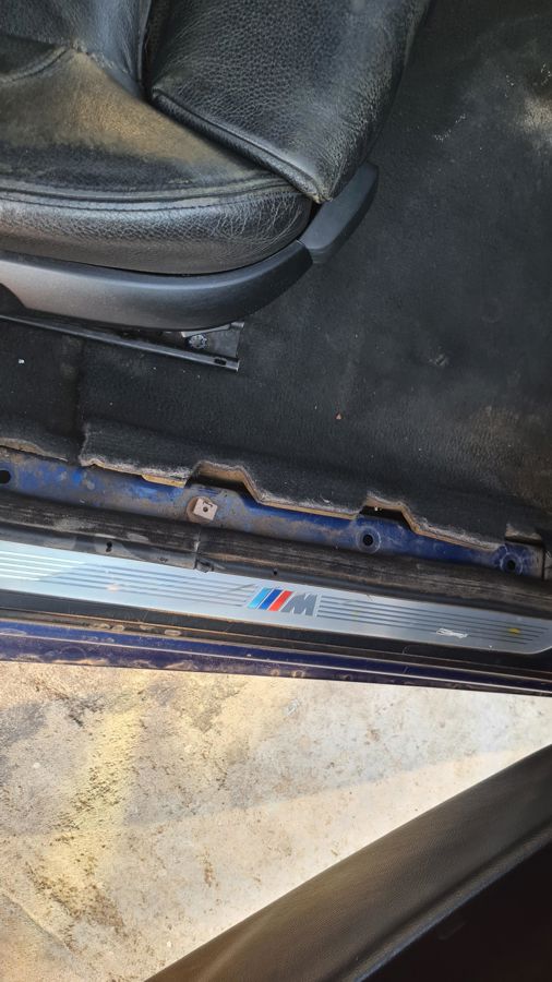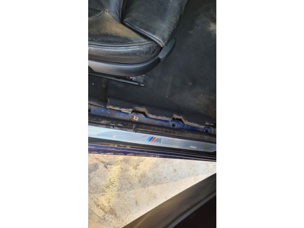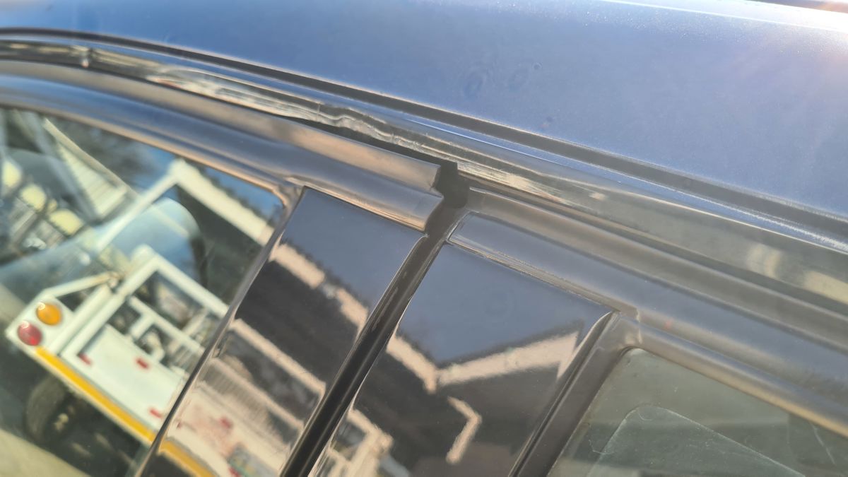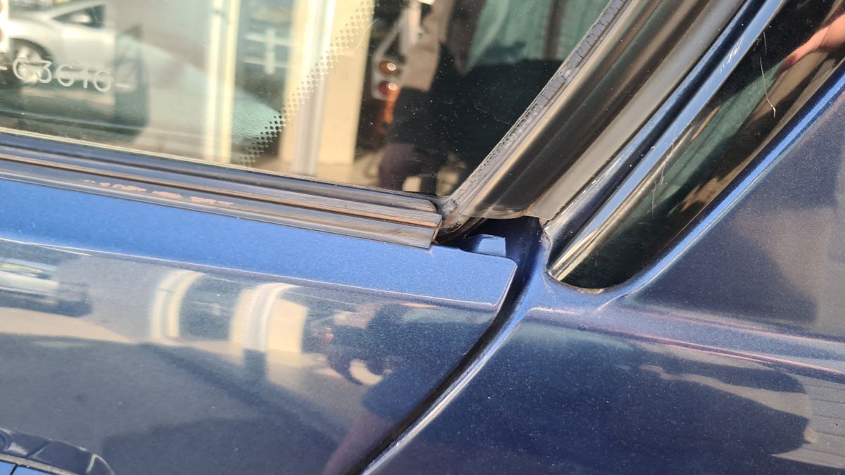Driver side window trim, bottom sill trim broken, rear window trim removed.